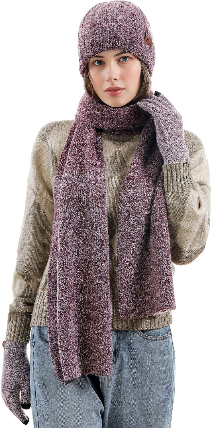 【Winter Warm Long Scarves】Soft, Warm, Lightweight and Breathable. The knitted long scarf has good elasticity and Anti-Pilling performance, allowing you to express your style in a variety of ways of wearing. Very suitable for travel or as a gift. 【Classic Style Knitted Hat Scarf Gloves Suits】Precise knitting crafts creates a beautiful and fashionable design that can be matched with most formal and casual clothing. Wonderful for women wearing while skiing, skating, sledding, camping, driving or any outdoor winter sports and daily use. Package Included: 1× Winter Beanie Hat + 1× Touchscreen Gloves + 1× Long Scarf (3 in 1 set); Show more