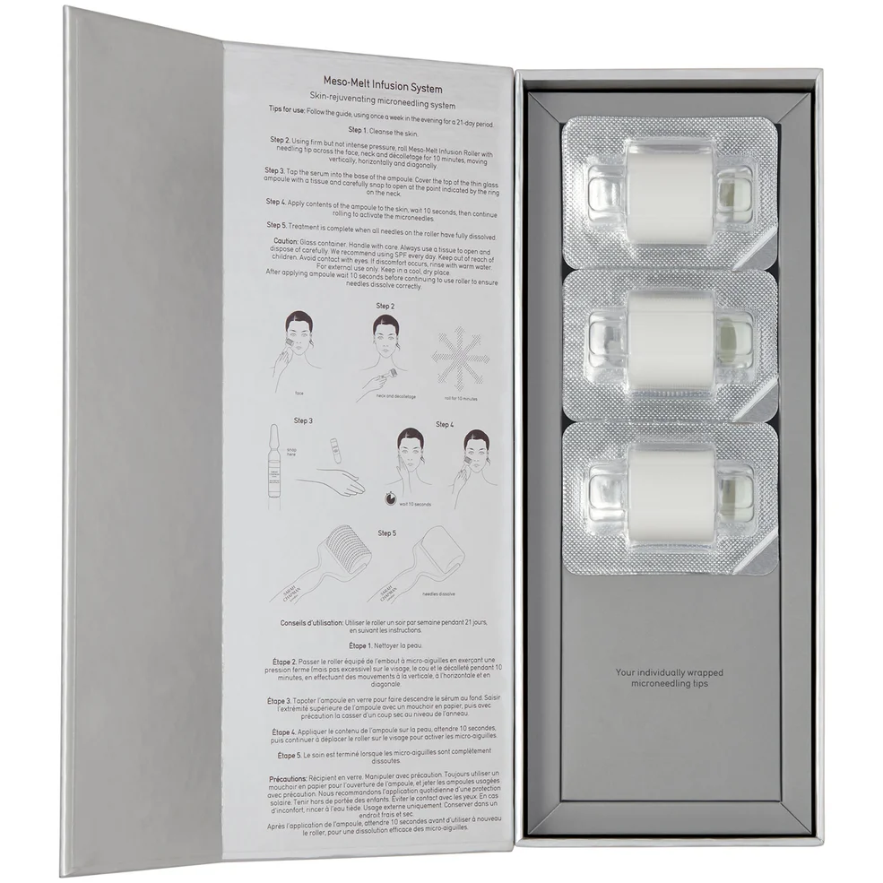 Introducing the Meso-Melt Infusion System - Sarah Chapman's innovative take on micro-needing - uniting a microneedle Meso Melt Infusion Roller, ampules of the Meso-Melt Pep⁸ Stem Cell Serum alongside Meso-Melt Needling Heads, this clever tool unites plant stem cell technology, Platinum Matrix-EM, hyaluronic acid and eight different peptides to deliver miraculous results. Perfect for those wanting in-office treatments whiel at home, those concerned by skin damage, advanced signs of ageing or are used to high potency skin care, this Meso-Melt Infusion System is a must try. The Meso-Melt Needling Heads feature MiniHA™, hyaluronic acid, SpecPed® SC-AO3, SpecPed® PP4P, SunPEPGHK-Cu5000 and Platinum Matrix-EM which help to deeply moisturise, enhance skin elasticity and repair damaged cells while reducing fine lines and promote the production of type 1 and 3 collagen. Used alongside the Meso-Melt Pep⁸ Stem Cell Serum, this impressive tool can decrease wrinkle depth by 61% in 28 days!